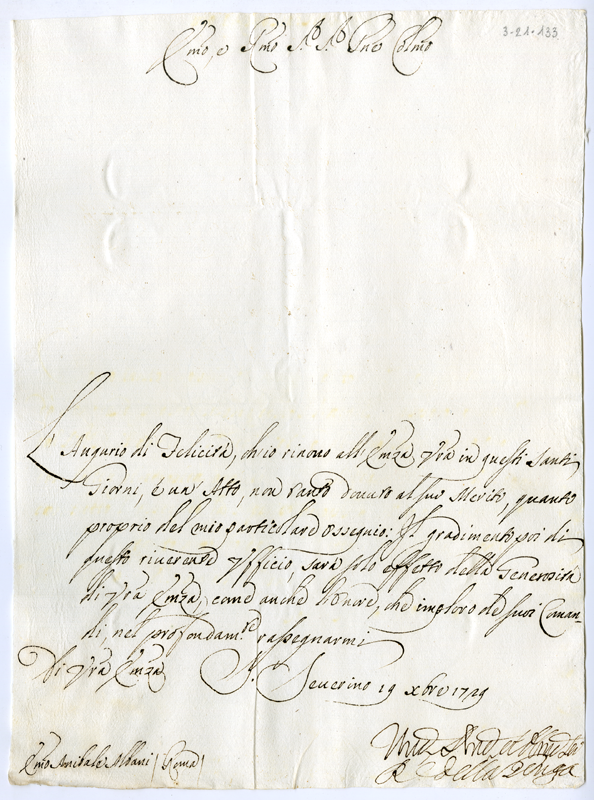 Lettera del principe della Genga al cardinale Annibale Albani (1729 dicembre 19)