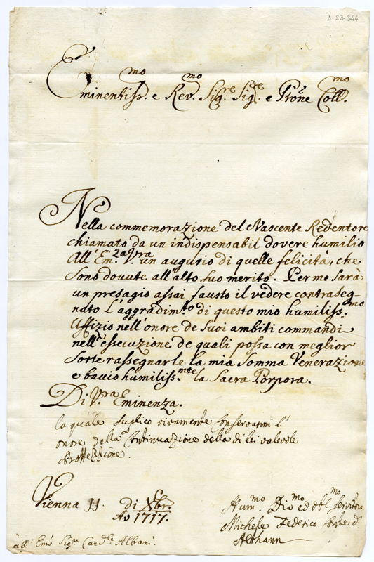 Lettera di Michele Federico conte d'Althann al cardinale Annibale Albani (1717 dicembre 11)