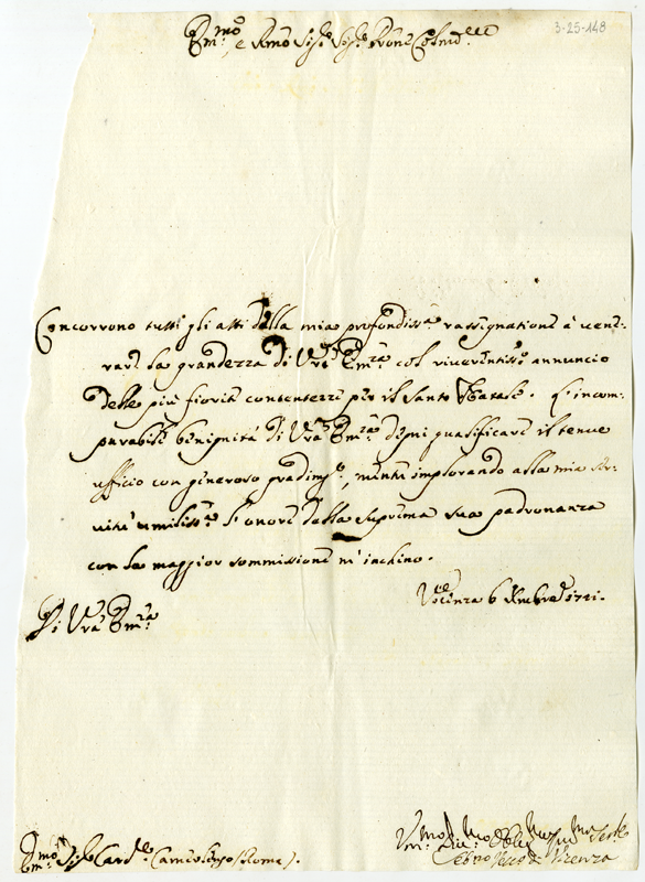 Lettera di Sebastiano vescovo di Vicenza al cardinale Annibale Albani (1721 dicembre 6)
