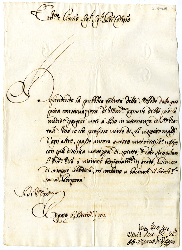 Lettera di Ottavio vescovo di Reggio al cardinale Annibale Albani (1712 dicembre 6)