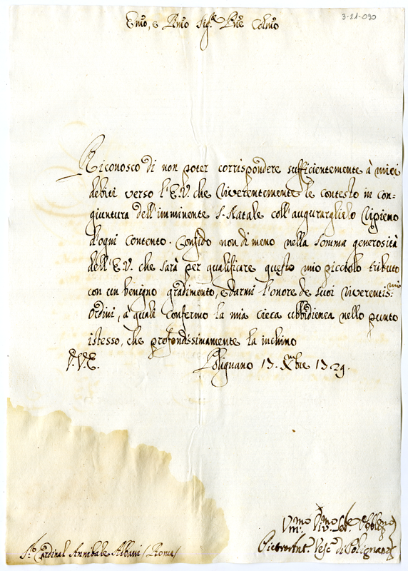 Lettera di Pietro Antonio vescovo di Polignano al cardinale Annibale Albani (1729 dicembre 17)