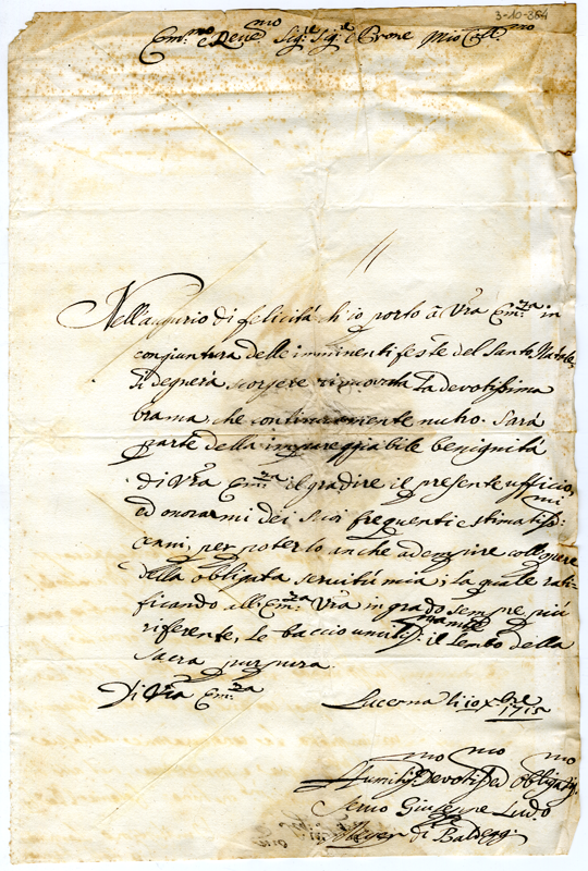 Lettera di Giuseppe Ludovico Meyer di Baldegg al cardinale Annibale Albani (1715 dicembre 10)