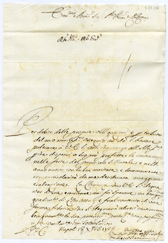 Lettera di Francesco Scaramuzza al cardinale Annibale Albani (1723 dicembre 18)