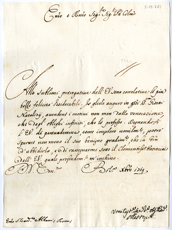 Lettera di Alessandro Pepoli al cardinale Annibale Albani (1719 dicembre)
