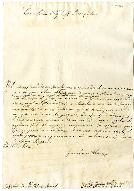 Lettera di Carlo Cassiano Carli al cardinale Annibale Albani (1731 dicembre 18)