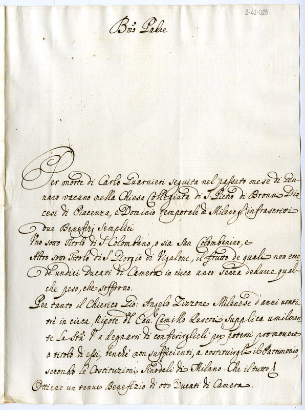 | dc.description | Chiede di poter ricevere due benefici semplici vacanti nella chiesa collegiata di Bronni diocesi di Piacenza | |