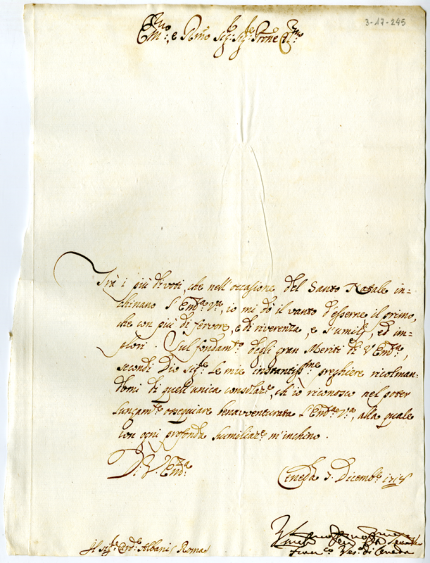 Lettera di Francesco vescovo di Ceneda al cardinale Annibale Albani (1718 dicembre 7)