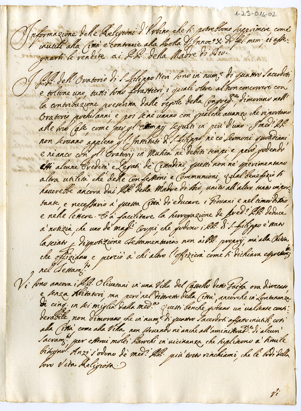 Informazione delle Religioni d'Urbino che si potrebbero sopprimere, come inutili alla Città, e contrarie alla Bolla d'Innocenzo X di felice memoria, et assegnarli le rendite ai Padri della Madre di Dio (1682)