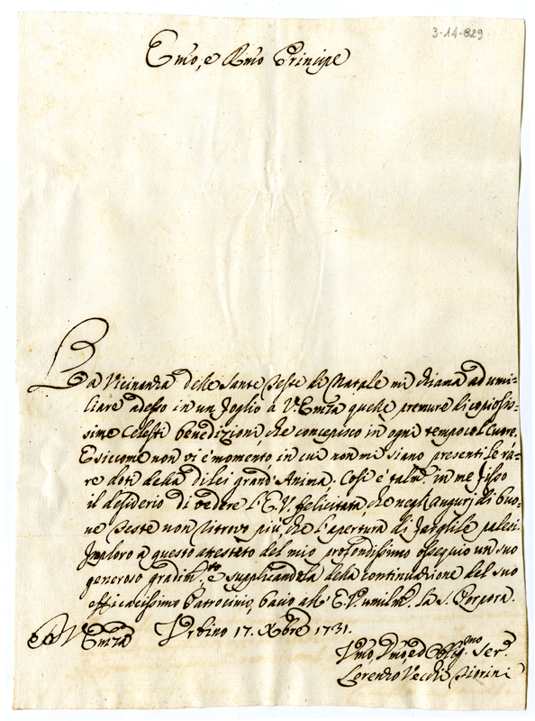 Lettera di Lorenzo Vecchi Fiorini al cardinale Annibale Albani (1731 dicembre 17)