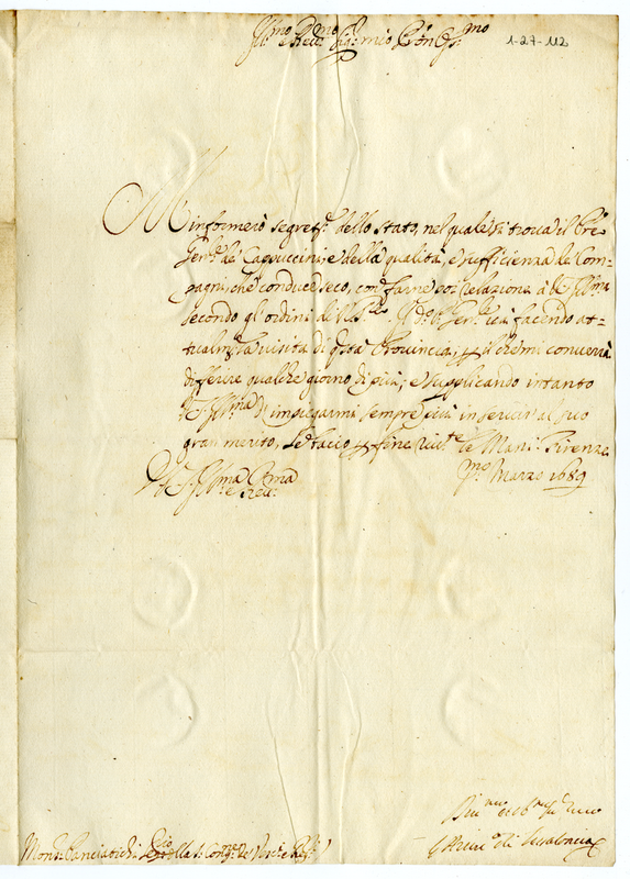 Lettera dell'Arcivescovo di Tessalonica a Monsignor Panciatici (1689 marzo 1)