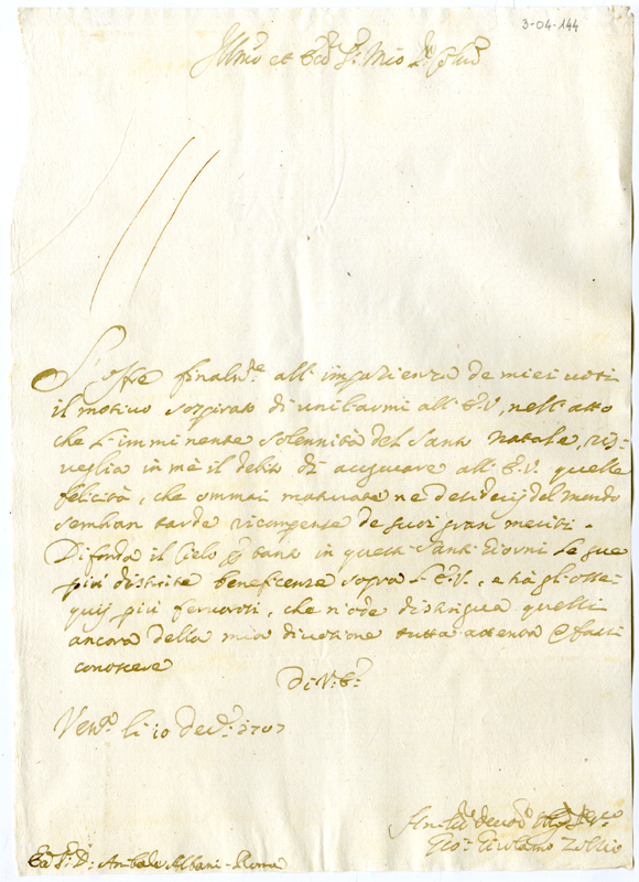 Lettera di Giovanni Girolamo Zollio ad Annibale Albani (1707 dicembre 10)