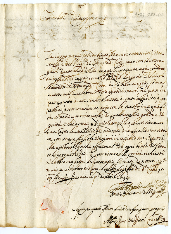 Attestato di Ginher Agostino e Orazio Graziano a favore del sacerdote don Gregorio Falciari, sacedote di buona fama e costumi (1694 dicembre 1)