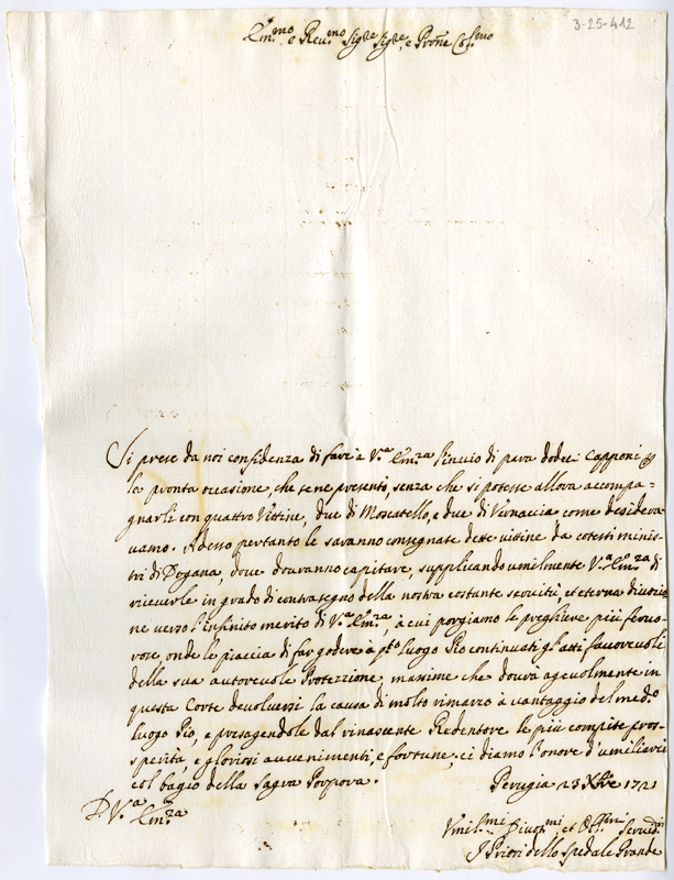 Lettera dei priori dell'ospedale grande di Perugia al cardinale Annibale Albani (1721 dicembre 23)