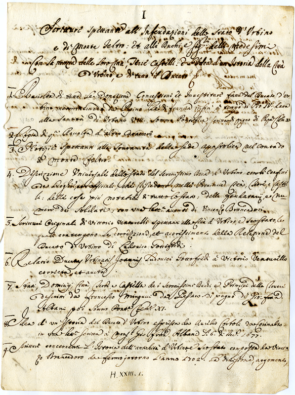 | bo.livello.titolo2 | Archivio Albani|"Scritture spettanti al sovrano dominio della Santa Sede Apostolica sopra lo stato d'Urbino, paesi annessi, e contea del Monte Feltro. All'infeudazioni di queste fatte da Sommi Pontefici, et alli Duchi, e signori delle medesimi con la notizia delle loro città, terre, castelli, e fortezze: e l'idea d'un istoria della città d'Urbino, e di tutto il suo Ducato"|Documenti contenuti | |
