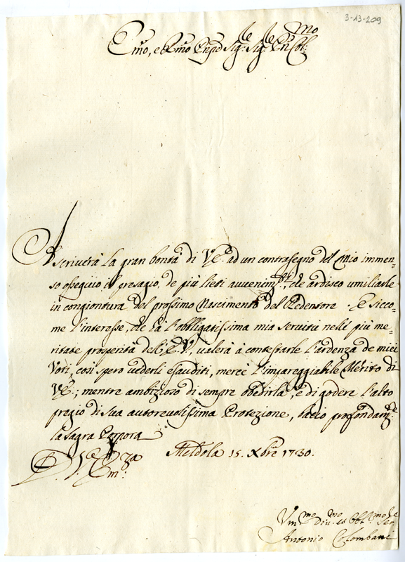 Lettera di Antonio Colombani al cardinale Annibale Albani (1730 dicembre 15)