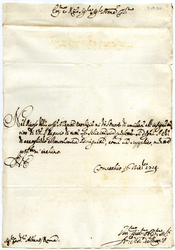 Lettera di Francesco vescovo di Comacchio al cardinale Annibale Albani (1719 dicembre 16)