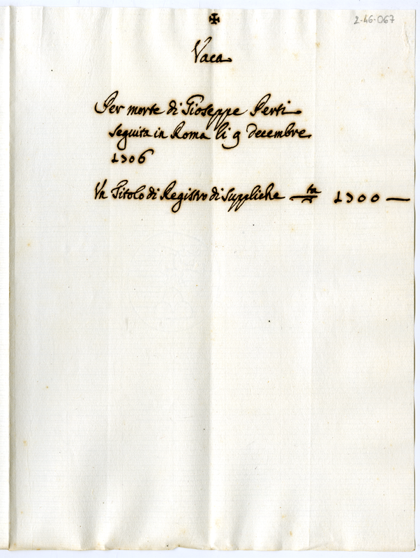 Titolo di registro di suppliche vacanti per morte di Giuseppe Perti (1706 dicembre 9)