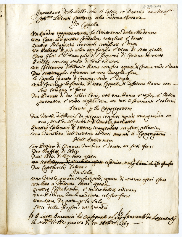 Inventario delle Robbe che si lascia in Dataria da Monsignor Illustrissimo Liberati spettanti alla medesima Dataria (1689 ottobre 15)