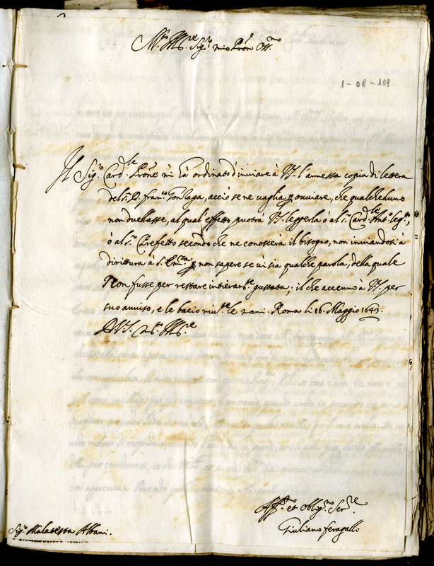 Lettera di Giuliano Feragallo a Malatesta Albani (1643 maggio 6)