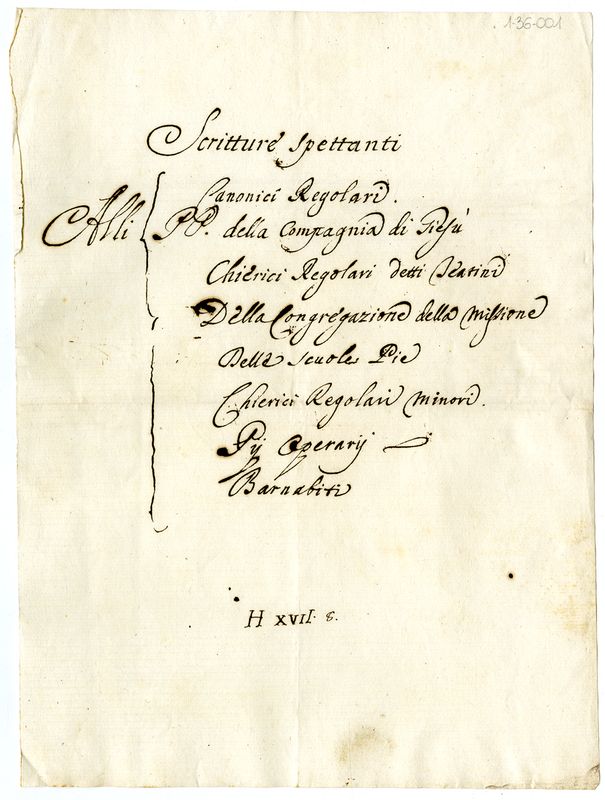 Scritture spettanti Alli Canonici Regolari. Padri della Compagnia di Gesù, Chierici Regolari detti Teatini, Della Congregazione della Missione, Delle Scuole Pie, Chierici Regolari Minori. Pii Operai, Barnabiti (1691-1721)