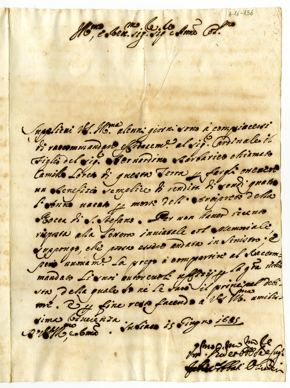 Lettera di Fabio Olivieri degli Abbati a Giovanni Francesco Albani (1685 giugno 15)