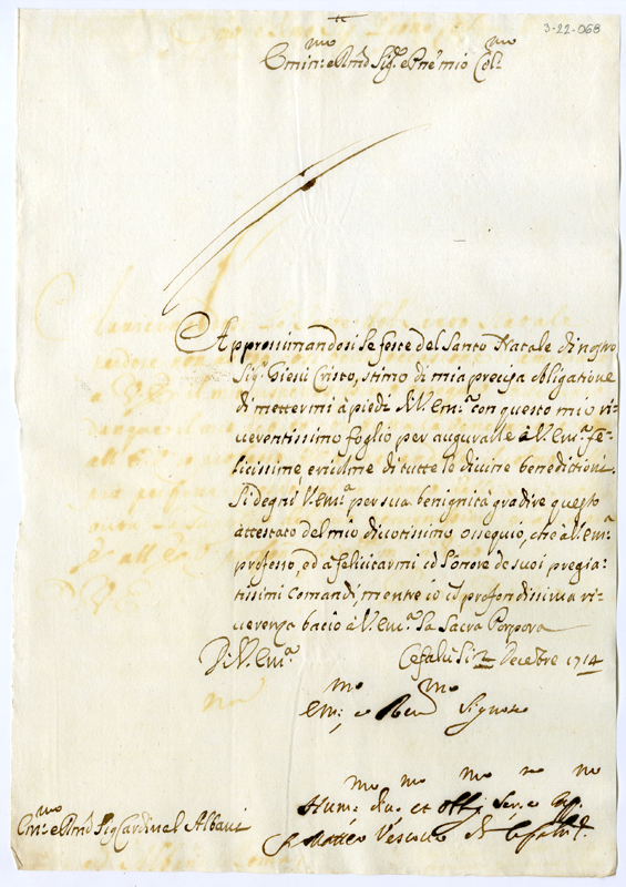 Lettera di Matteo vescovo di Cefalù al cardinale Annibale Albani (1714 dicembre 2)