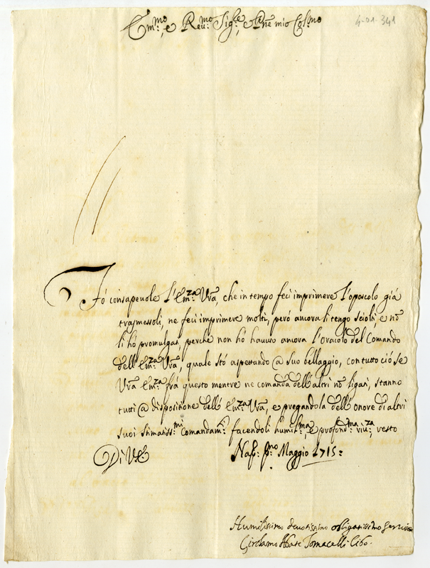 Lettera di Girolamo Tomacelli Cibo al Cardinale Annibale Albani (1715 maggio 1)