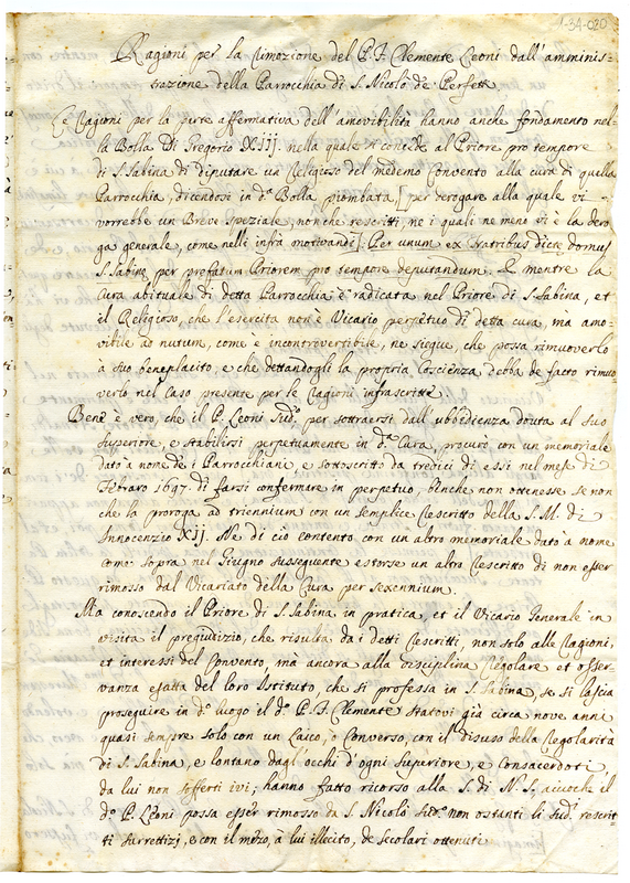 Ragioni per la rimozione del padre Clemente Leoni domenicano dall'amministrazione della parrocchia di san Nicolò dei Perfetti dipendente dai padri domenicani di Santa Sabina (1700-1721)