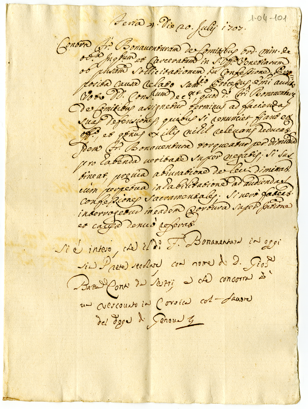 Causa del Sant'Uffizio contro Francesco Bonaventura. Una nota di altra calligrafia informa che ora Francesco Bonaventura si presenta con il nome di Conti Giovanni Battista per un vescovato in Corsica con il favore del doge di Venezia