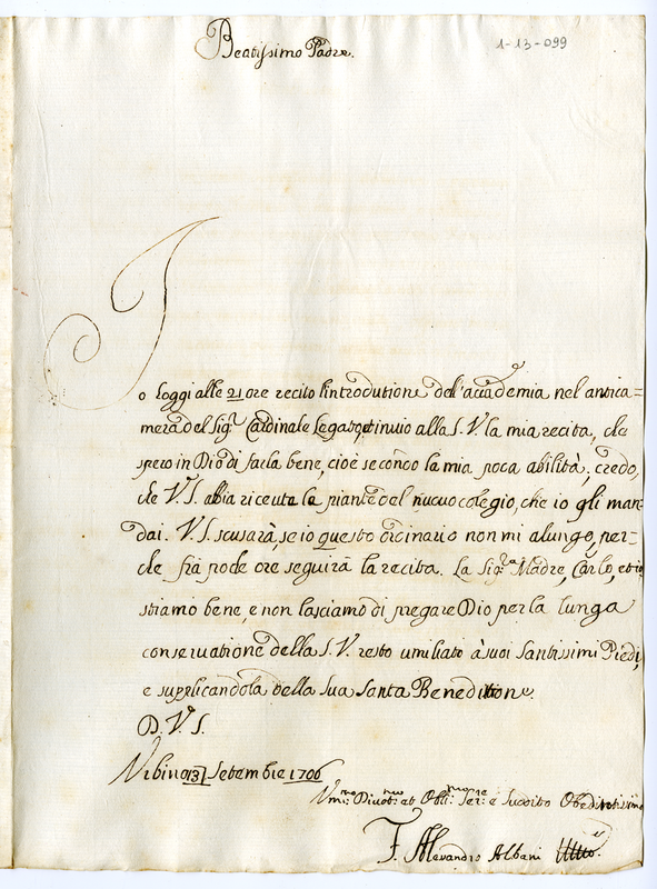 Lettera di Alessandro Albani a papa Clemente XI (1706 settembre 13)