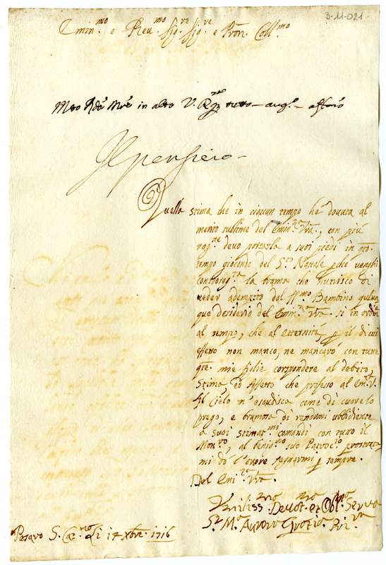 Lettera di suor Maria Aurora Grazia priora al cardinale Annibale Albani (1716 dicembre 17)