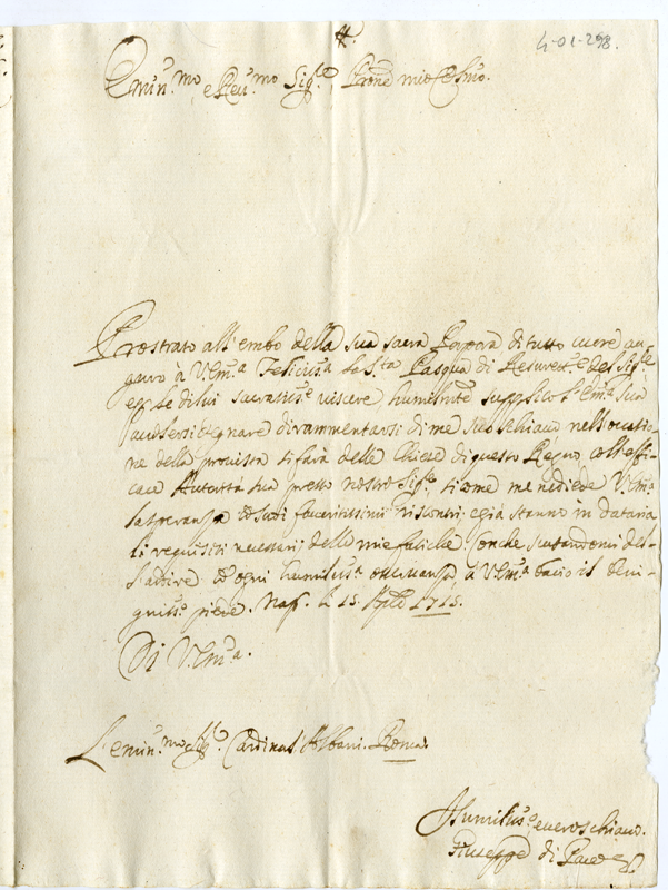 Lettera di Giuseppe di Pace al Cardinale Annibale Albani (1715 aprile 15)