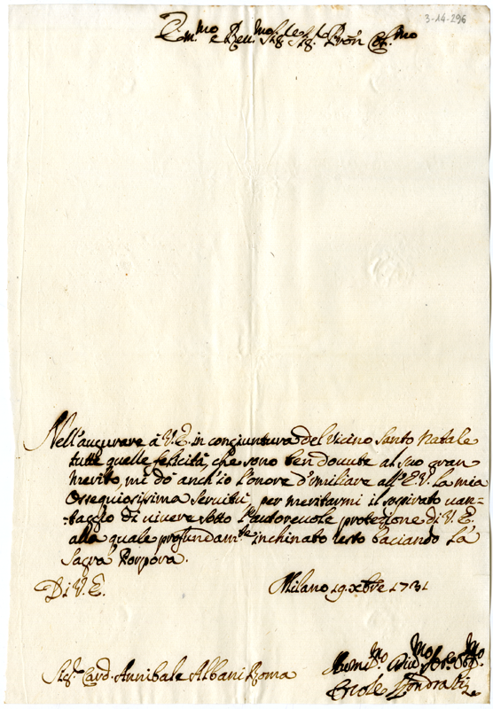 Lettera di Ercole Sfondrati al cardinale Annibale Albani (1731 dicembre 19)