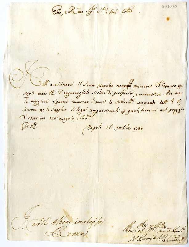 Lettera del principe di Belacker al cardinale Annibale Albani (1730 dicembre 15)