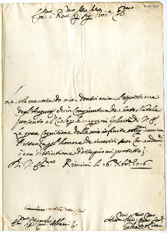 Lettera di Galeazzo Cima al cardinale Annibale Albani (1716 dicembre 16)