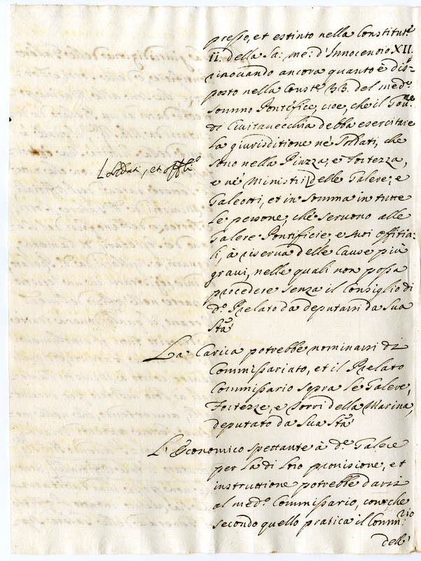 Sul possibile incarico da dare a un Prelato sulla giurisdizione delle galere Pontificie, delle Torri e Fortezze (1700-1721)