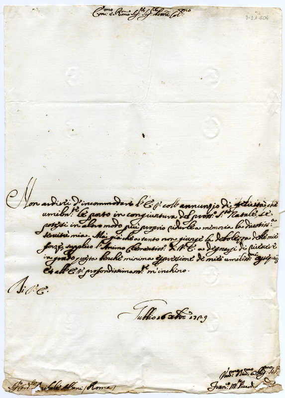 Lettera di Francesco Maria Piccardi Andreoli al cardinale Annibale Albani (1729 dicembre 16)