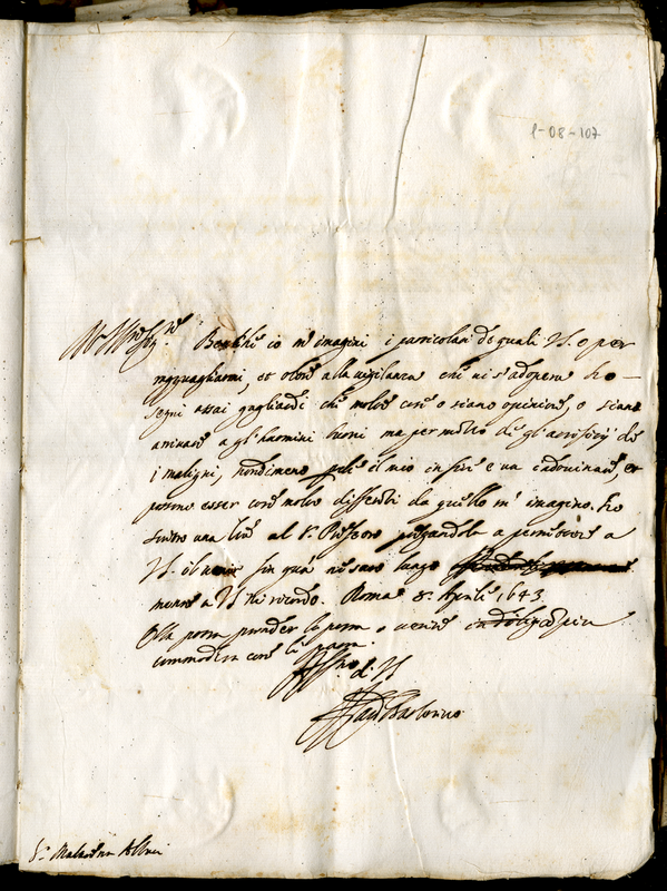 Lettera del cardinale Barberini Francesco senior a Malatesta Albani (1643 aprile 8)