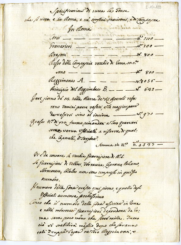 | bo.livello.titolo2 | Archivio Albani|"Miscellanea di cose Militari spettanti alle compagnie di soldati, Officiali, Paghe, riforme, accrescimenti, alle Fortezze, Castelli, Presidii, e posti guardati dallo Stato della Chiesa Romana in Italia, et a quello del Ducato di Parma e di Piacenza. Nel Pontificato di Papa Clemente XI. I."|"Vari fogli, e biglietti di monsignor D'Aste Commissario dell'armi, con altre scritture, ò memoriali militari"|Documenti contenuti | |