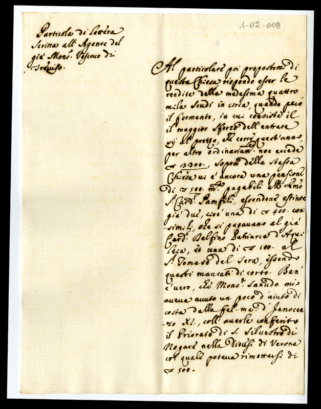 Parte di lettera scritta dall'agente del già Mons. Vescovo di Treviso (1700-1721)