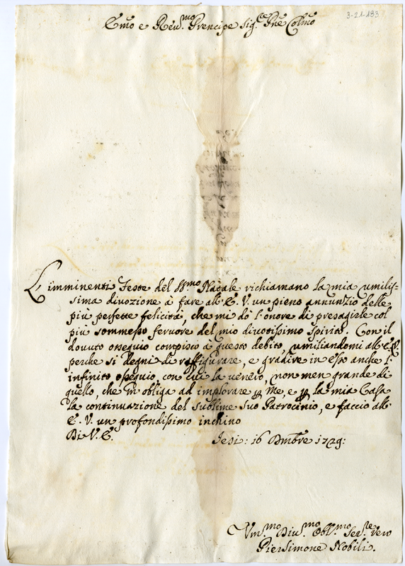 Lettera di Pier Simone Nobili al cardinale Annibale Albani (1729 dicembre 16)