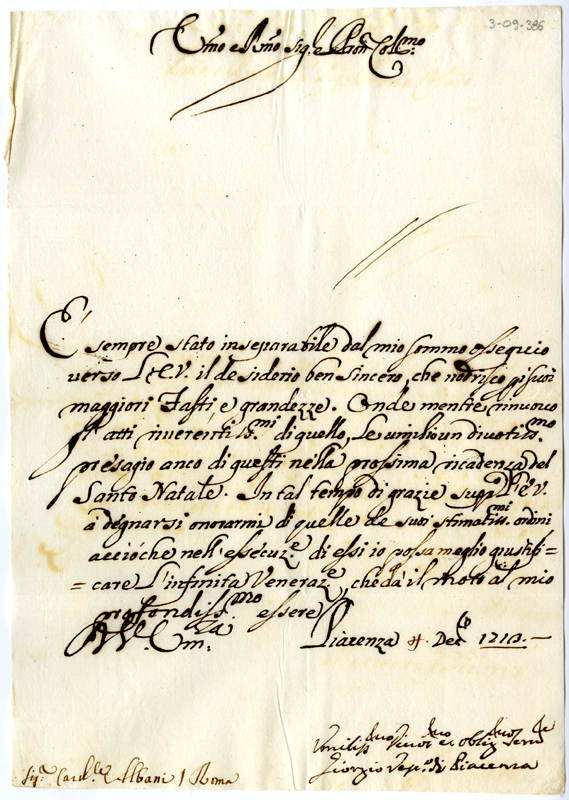 Lettera di Giorgio vescovo di Piacenza al cardinale Annibale Albani (1713 dicmebre 4)