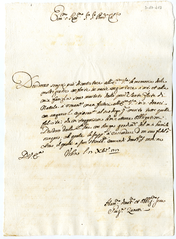 Lettera di Giuseppe Zanetti al cardinale Annibale Albani (1717 dicembre 17)