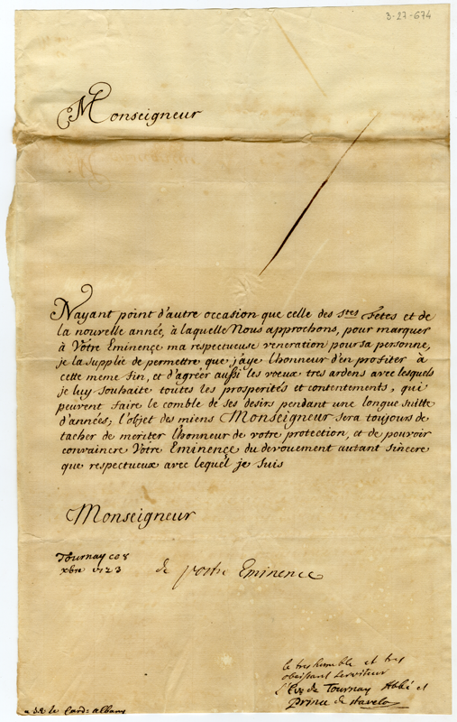 Lettera del vescovo di Tournai al cardinale Annibale Albani (1723 dicembre 8)