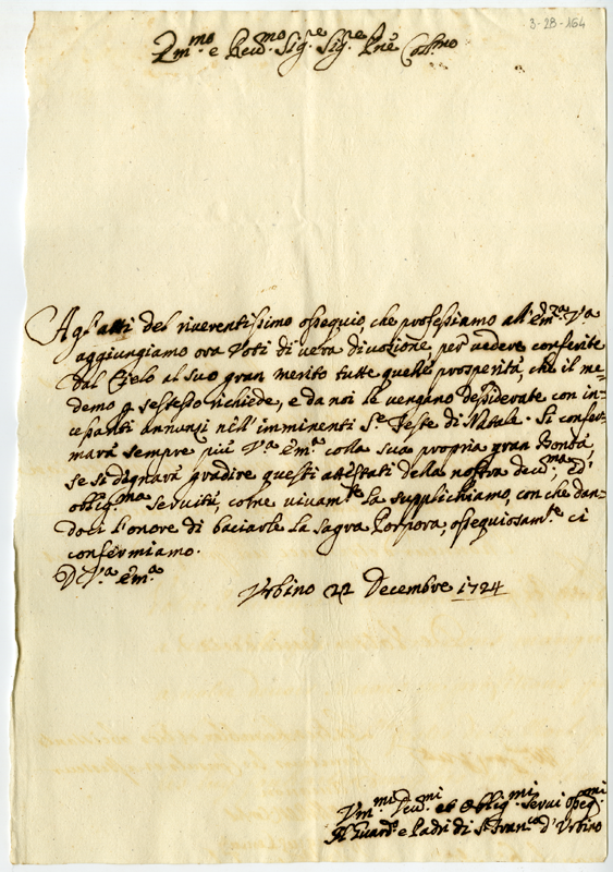 Lettera del guardiano e padri di San Francesco di Urbino al cardinale Annibale Albani (1724 dicembre 22)