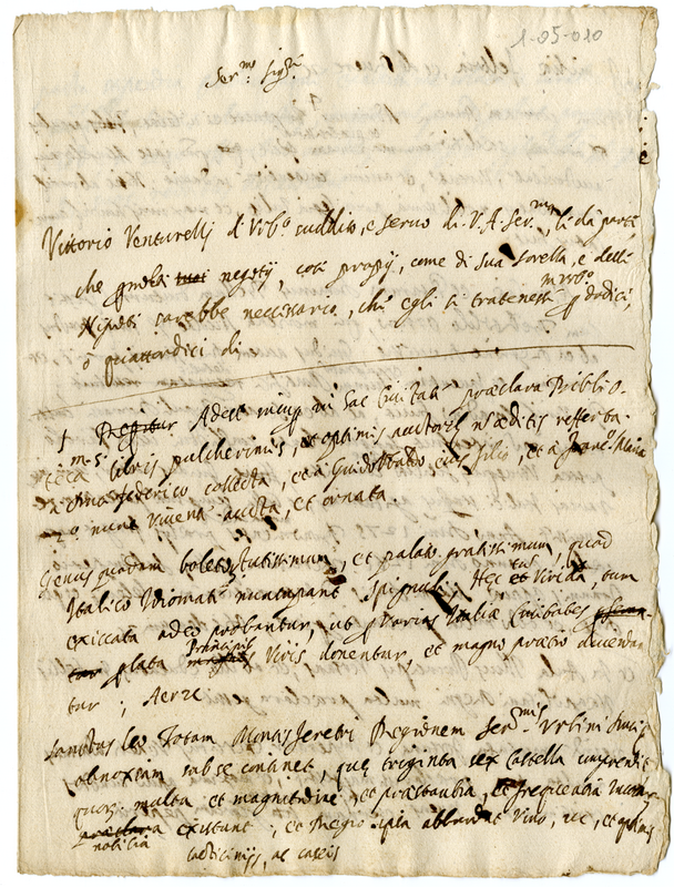 Il documento contiene l'inizio di una lettera di Vittorio Venturelli al duca di Urbino. Seguono appunti storici di vario genere