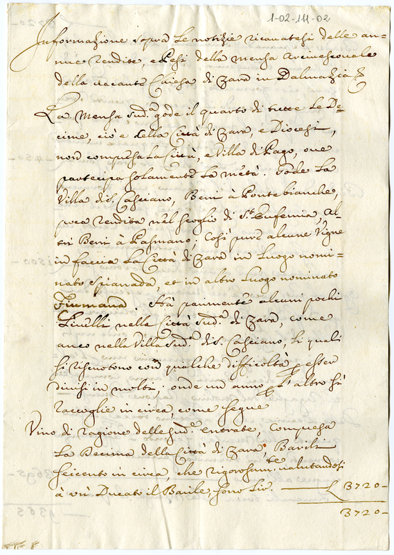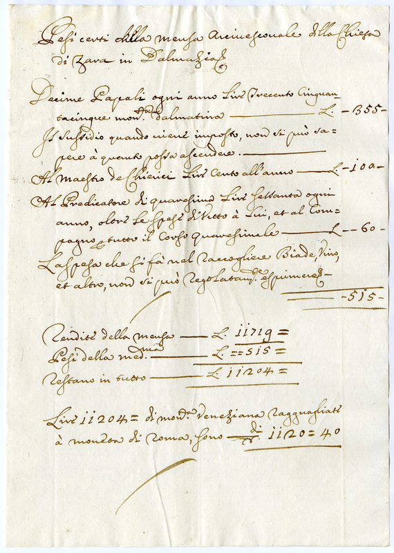 Informazione sopra le notizie ricavatesi dalle annue rendite, e pesi della mensa arcivescovale della vacante chiesa di Zara in Dalmazia