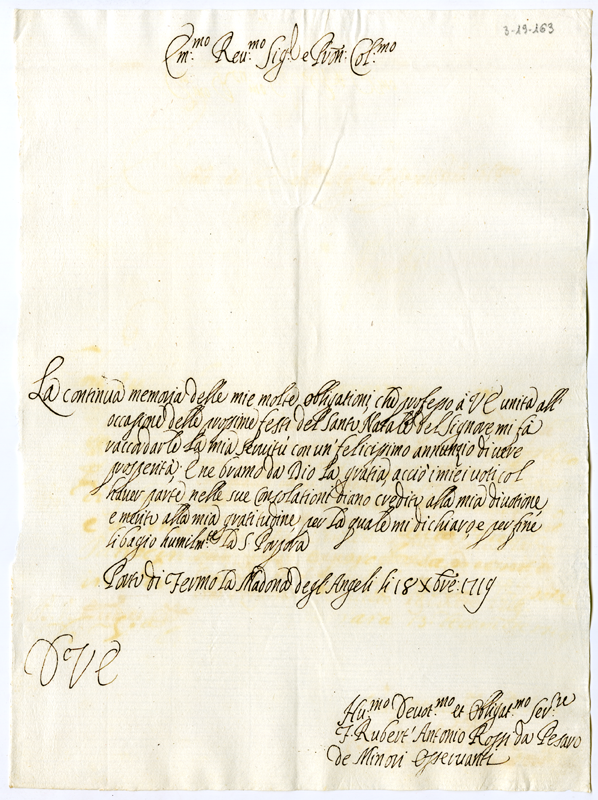 Lettera di fra Roberto Antonio Rossi da Pesaro dei minori osservanti ad Annibale Albani (1719 dicembre 18)