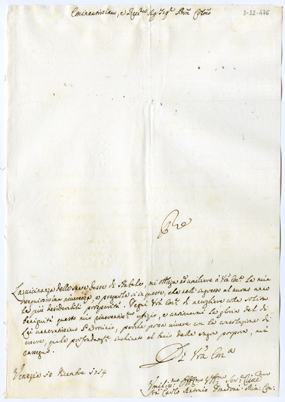 Lettera di fra Carlo Antonio Donadoni al cardinale Annibale Albani (1714 dicembre 15)