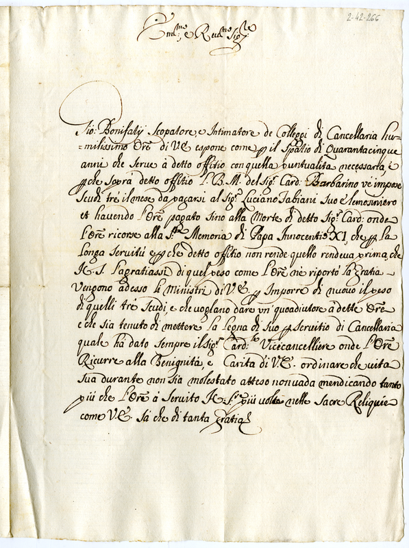 Lettera di Giovanni Bonifazi scopatore dei collegi di cancelleria al cardinale Ottoboni (1700-1721)